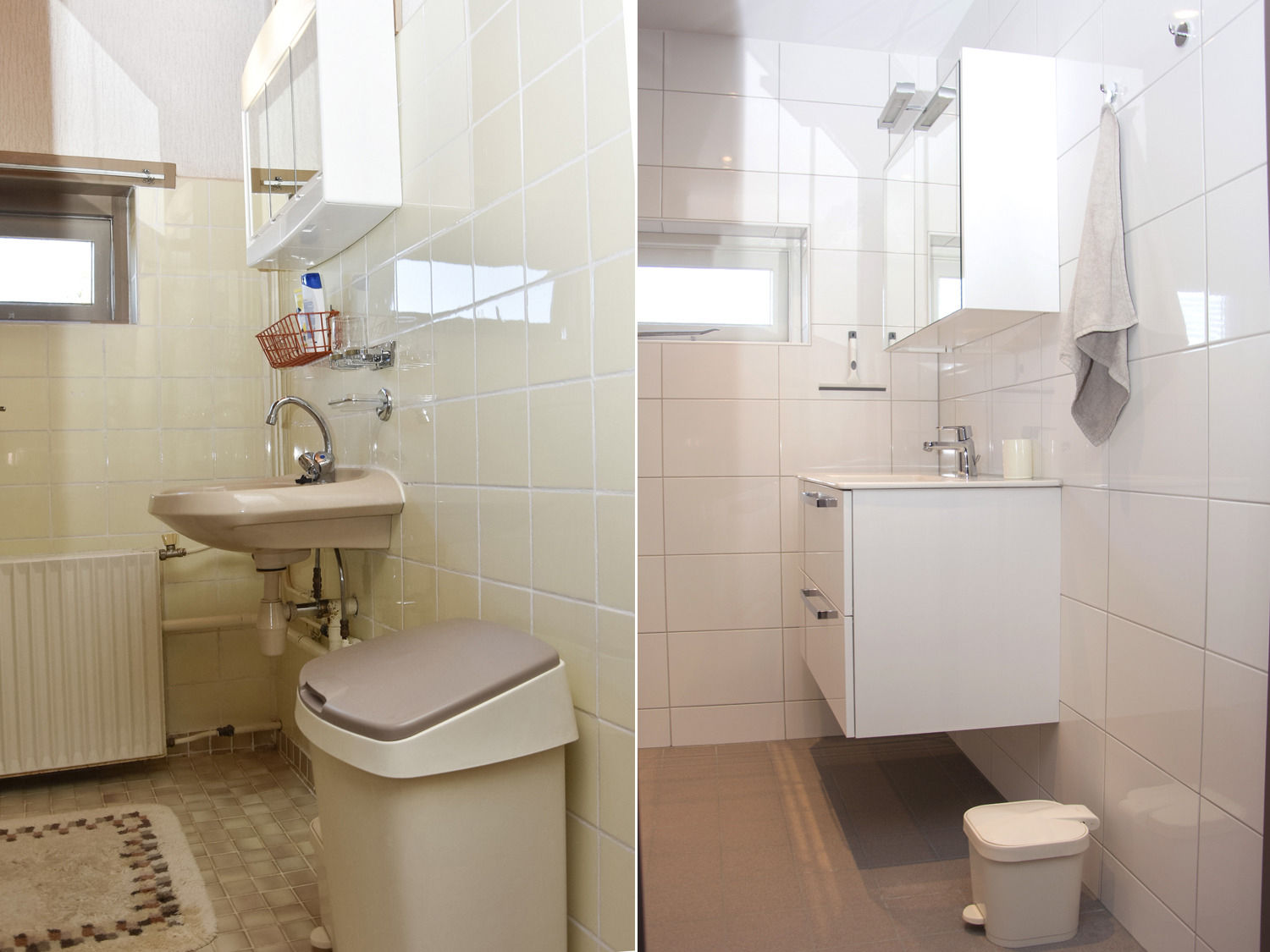 Voor-en-na-foto's  van een door ons uitgevoerde renovatie aan het badkamermeubel.